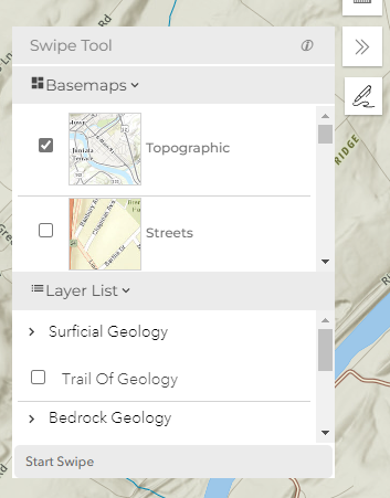 - The basemap and layer you chose in the swipe menu appear on the right side of the bar