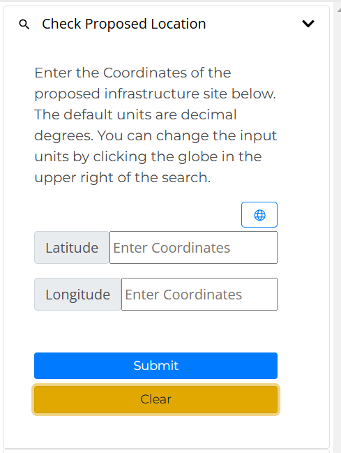 Selecting the magnify glass expands a text box in which an address or lat/long is to be entered. After entering the information, click on the magnifying glass again to perform the search. The map will zoom to and recenter on the requested location.