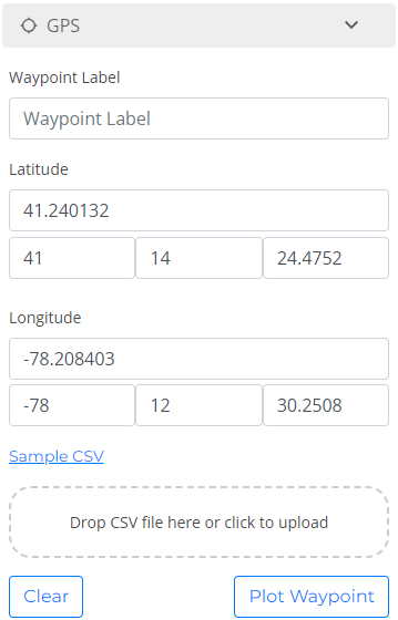Place names may also be entered and may result in a drop-down list of choices. Lat/long will be accepted as decimal degrees in several formats: